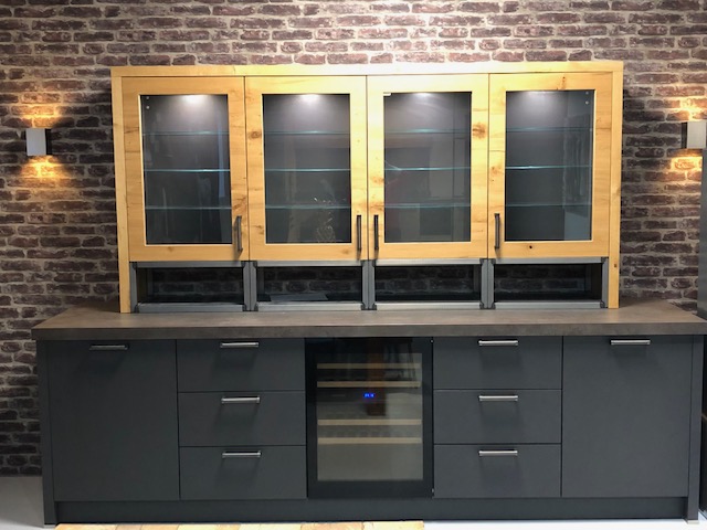 De glaskasten zijn van robuust hout en de onderkasten zijn ultra mat zwart.